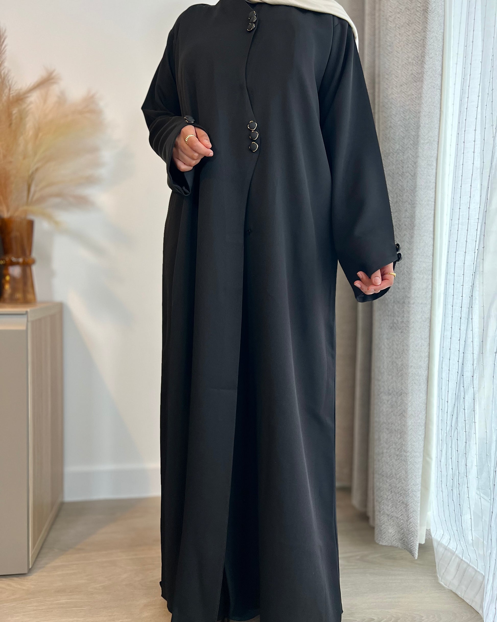 The Malika Abaya is a statement of refined elegance and modern sophistication. Designed in a timeless black hue, this piece features a structured yet fluid silhouette, offering the perfect balance between poise and effortless grace. The smooth, flowing fabric drapes beautifully, while the sleek button details add a touch of polished refinement.